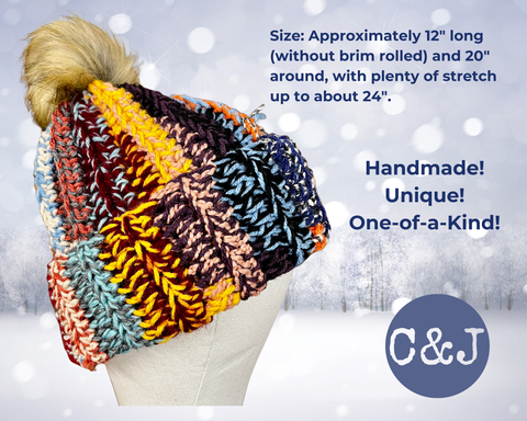 One-of-a-Kind Cozy Winter Beanie -- Nothing goes to waste in my crochet shop – and that includes leftover yarn! This handmade beanie is created from a mix of yarn scraps from my other projects, vintage yarns inherited from my grandmother, and unique vintage skeins I’ve rescued from estate sales and thrift stores.