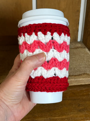 Handmade Crochet Coffee Cozy - Red, White & Pink Yarn Cup Sleeve