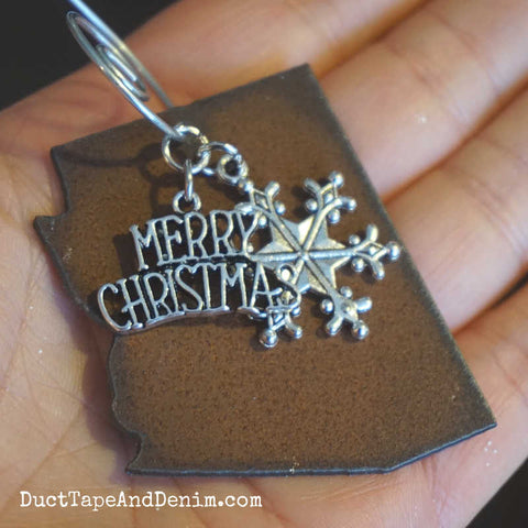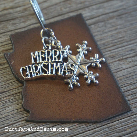 * ONE rustic metal state shape * TWO antiqued silver charms -- Merry Christmas & a snowflake * ONE spiral wire hanger * in a kraft paper gift box