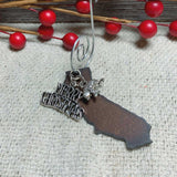 These rustic metal California ornaments are a great addition to any California Christmas tree and a great gift for someone who has just moved to or moved out of their home state, a vacation souvenir, an engagement gift, or a wedding party favor. These state shapes are cut from steel here in the USA and treated to look rusty. ALL states are now available.