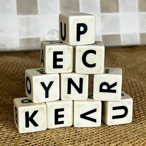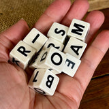 This set of 10 vintage white dice features black letters on each side—most likely from an old Scribbage-style game. Each die is six-sided, with a different letter on every face.
