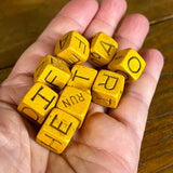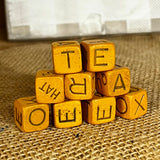 These are the oldest and most worn letter dice in today’s batch—a set of 9 tiny wooden blocks, painted yellow with faded black letters. One of the dice even has words instead of single letters, adding to its unique vintage appeal.