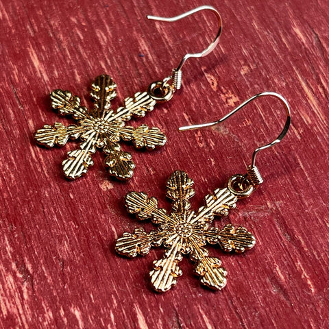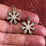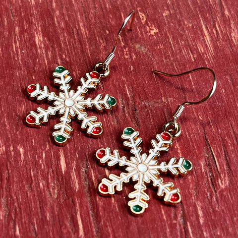 These Snowflake Christmas Earrings are a festive twist on a winter classic! Each charm is a rose gold-colored snowflake painted with white enamel and tipped in red and green - simple, cheerful, and just right for the season.